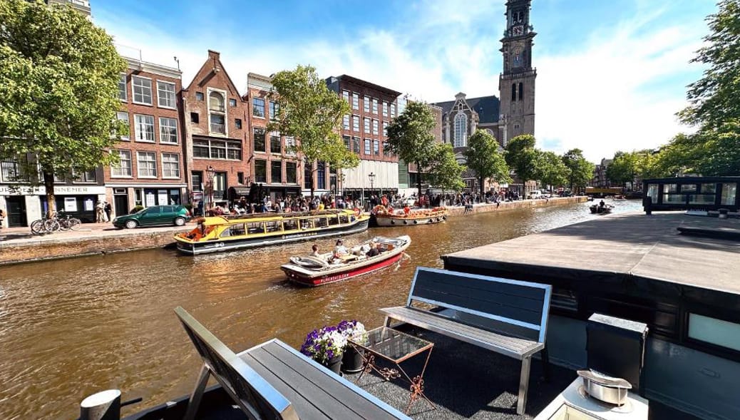Hier können Sie das lebhafte Treiben der vorbeifahrenden Boote beobachten und Amsterdams einzigartige Atmosphäre hautnah erleben.